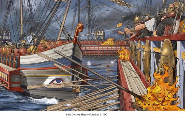 Вот так, или очень похоже, на протяжении столетий проходили сражения на море… Лоик Берриен. Битва при Акциуме«…сделал на них искусные украшения, поставив вокруг высокие столбы, а на столбах полное вооружение — на вечную память, и подле оружий — изваянные корабли, так что они были видимы всеми, плавающими по .