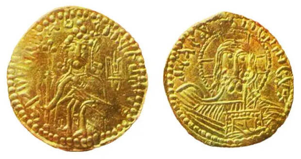 Так, греки, которые пытались откупиться от русского князя Святослава Игоревича, занявшего Болгарию, предлагали ему золото и паволоки (драгоценные ткани, шёлк), но он в итоге взял сталью (оружие). В это время Русь не знала слово «деньги», наиболее древним выражением их понятия являлся скот. Летописи, «Русская правда» (свод законов) и другие источники показывают, что именно скот заменял деньги. Отсюда «скотница» (казна) русского князя Владимира Святославича, крестителя Руси. А сборщик налогов назывался «скотник». Также в качестве денег использовался драгоценный мех, который постепенно вытеснил скот. Наиболее распространённым был мех куницы, от него понятие «куны». Прочный и красивый, мех куницы стал денежной единицей. На шкуры зверей, которые назывались куны, ногаты (шкурка соболя), бела (шкурка горностая), векша (летняя рыжая шкурка белки) и т. д., покупались и продавались различные товары. Куски кожи или меха были монетными знаками в меновой торговле. Иностранцы, которые посещали Русь в раннем средневековье, сообщали, что у русов во время торговли были меховые деньги – куний, соболиный и беличий мех. Персидский поэт и мыслитель Низами Гянджеви в поэме «Искандер наме» (конец XII – начало XIII вв.) писал: Цену меха узнав, царь промолвил: «На что жеСлужат шкуры вон те, знать хотел бы я тоже?»Соболиных и беличьих множеств шкурЦарь узрел; был их цвет неприветливо бур.Все облезли они, лет казалось им двести,Но на лучшем они были сложены месте.Шах взирал в удивленье: на что же, на что жСтолько вытертых шкур и морщинистых кож?«Неужели они, – он спросил, – для ношенья,Иль, быть может, всё это – жилищ украшенья?»Молвил рус: «Из потрёпанных кож, государь,Всё рождается здесь, как рождалось и встарь;Не смотри с удивленьем на шкуры сухие.Это деньги, и деньги, о, царь, неплохие.Эта жалкая ветошь – в ходу и ценна,Самых мягких мехов драгоценней она».Серебряный милиарисий КонстантинаМеталлические деньгиПо мере государственного развития меха вытеснялись металлическими деньгами. Благодаря развитой торговле со странами Запада и Востока, а также и походам русских князей, русы были знакомы с металлическими монетами соседей. В частности, на территории России найдены клады с древнегреческими и римскими монетами. В основном это римские серебряные денарии (динарий). Начиная с VI века на Русь начали проникать восточные, или куфические монеты (при нанесении цитат из Корана использовали куфический стиль арабского письма): серебряные дирхемы и золотые динары (название произошло от римского динария). Но с конца X века поток дирхемов начал иссякать: политическая ситуация в арабском мире ухудшилась, серебряные рудники оскудели. Зато в это время на Руси появились монеты Второго Рима – Византийской империи, которую не раз тревожили своими походами русские князья и воеводы. Также с Константинополем-Царьградом существовала развитая торговля: т. н. «путь из варяг в греки». На XI–XII вв. приходится наибольшее распространение монет Византийской империи – серебряных милиарисий, а также золотых и медных монет. В этот же период серебряные монеты – динарии, ввозили на Русь (в основном через Великий Новгород) из Европы. Европейские серебряные монеты ходили в основном в Северной и Северо-Восточной Руси. Русь в этот период не имела своих серебряных и золотых рудников, поэтому в торгов